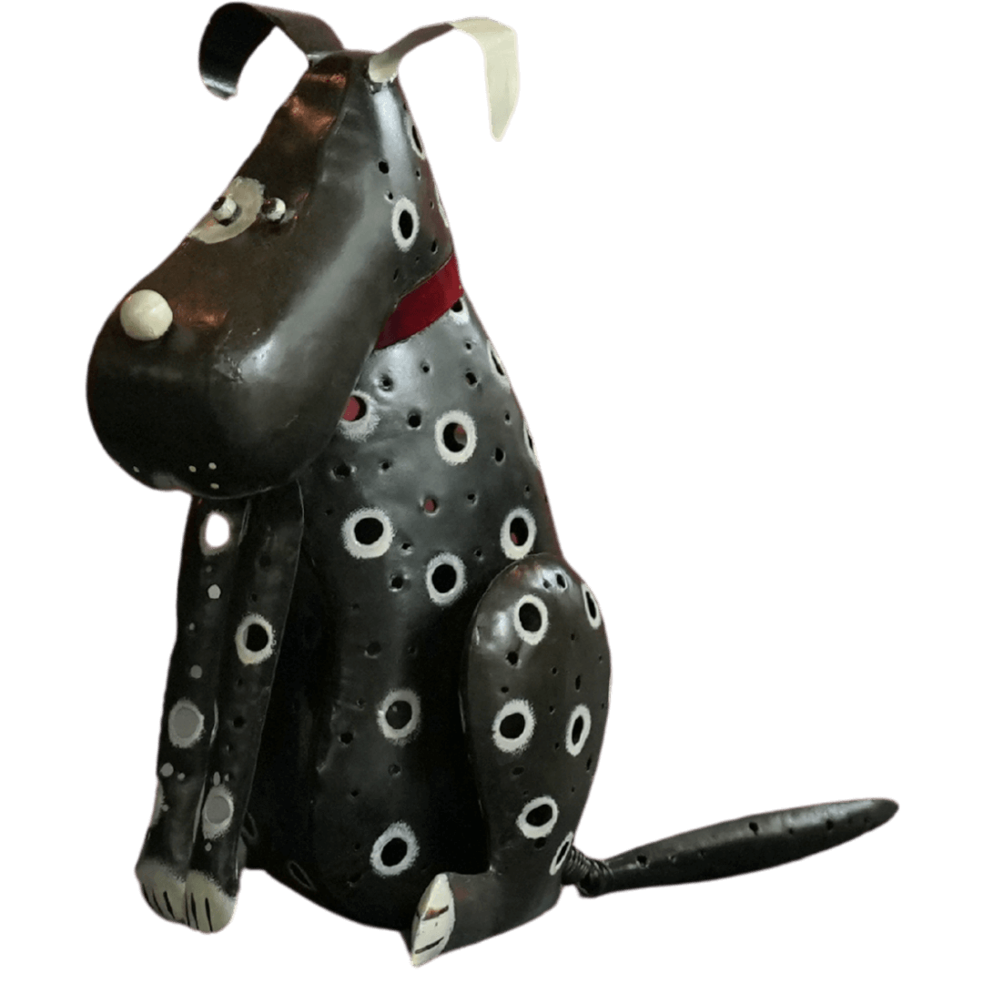 A stylized, sitting canine sculpture meticulously crafted from hand-cut iron sheets using traditional Pandai Besi techniques, featuring an oversized, rounded snout and playful, floppy ears. The obsidian-black body is defined by a dense arrangement of hand-punched circular perforations, each ringed in stark white paint to create a bold, rhythmic spotted pattern that allows light to filter through the hollow frame. A vibrant crimson collar provides a sharp focal point at the neck, while one of the hind legs is designed with a discrete hinge, opening to reveal an internal platform specifically sized for a T-light candle. This charming piece, inspired by a cherished pet, transforms from a whimsical sculptural figure into an ambient light source, casting soft, dappled shadows through its perforated metallic hide.
