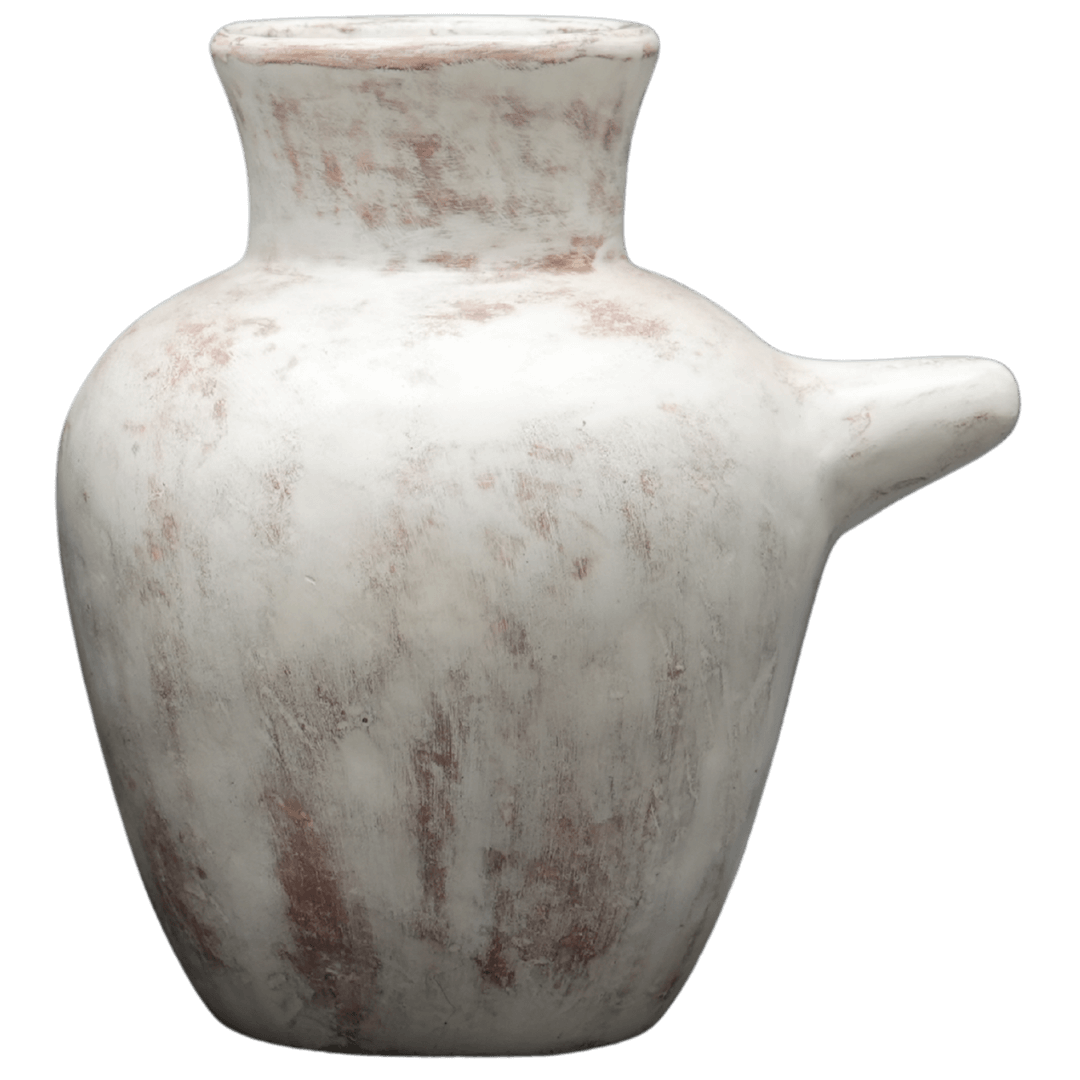 A stout terracotta vessel featuring a high, rounded shoulder and a wide, slightly flared neck. The form is distinguished by a singular, tapered spout extending upward from the mid-section, drawing inspiration from the traditional Balinese Kendi (water vessel) silhouette. The surface is finished with a heavy, multi-toned white wash that has been strategically abraded to reveal the natural, earthy terracotta grain beneath. This distressed treatment creates a rugged, calcified appearance, evoking the texture of aged limestone or sun-bleached earth. The lack of glossy glaze emphasizes the raw, porous quality of the hand-worked clay.