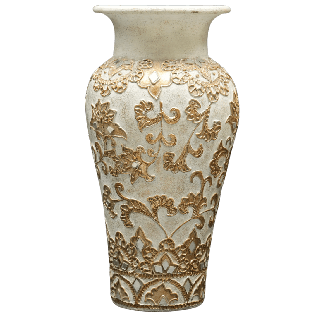 An elegant, tapered terracotta vessel featuring a wide, flared “trumpet” rim and a slender base. The body is treated with a weathered ivory wash that serves as a neutral canvas for opulent, high-relief ornamentation, most notably a flowing botanical motif of hand-carved vines and blossoms highlighted with traditional Prada gold leaf. This ornamentation is further elevated by geometric bands of glass mosaic inlays placed within the floral centers and along the horizontal registers of the neck and foot, catching the light with a rhythmic sparkle reminiscent of Balinese Candi decorations. The unadorned, matte white neck provides a clean visual contrast, grounding the dense, regal artistry of the lower body.