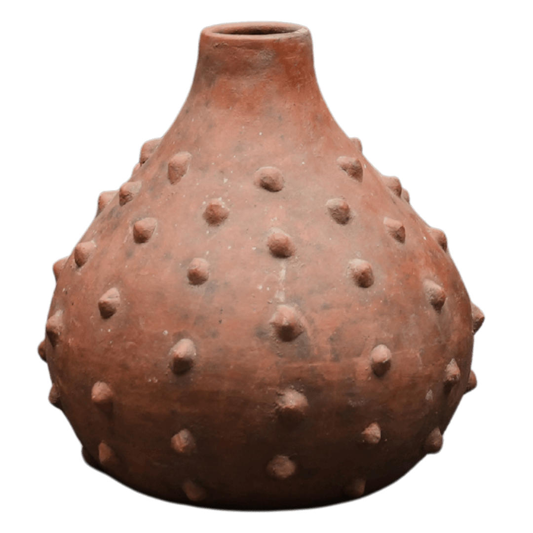 A bulbous, gourd-shaped terracotta vessel featuring a wide, rounded body that tapers gracefully into a short, narrow cylindrical neck. The exterior surface is defined by a dense, rhythmic arrangement of hand-pinched conical studs, applied using the traditional Cubit technique to create a high-relief, tactile texture that envelops the entire form. The piece is left in its natural, unglazed state, showcasing a warm polychrome palette of raw umber and burnt sienna that highlights the elemental, sun-baked quality of the clay. This organic ornamentation draws inspiration from the rugged textures found in the Balinese landscape, emphasizing a primitive yet sophisticated artisanal aesthetic through the repetition of small, hand-wrought sculptural details.
