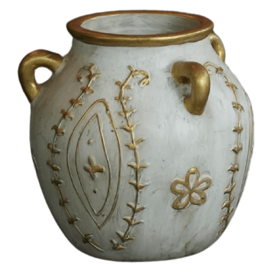 A robust, wide-bodied terracotta urn featuring four small, symmetrical looped handles positioned around a thick, gilded rim. The exterior is coated in a heavily textured alabaster lime-wash, providing a rustic, stone-like foundation for delicate hand-carved relief work. Rhythmic, vertical vines and singular blooming lotus petals are etched into the clay using the Ukir technique, each motif highlighted with a subtle champagne-gold patina that lends a regal, ceremonial quality to the piece. This vessel balances its solid, earthy form with fine, light-catching details inspired by the ornate carvings found in Balinese temple architecture, resulting in a timeless artisanal object that emphasizes tactile depth and weathered elegance.