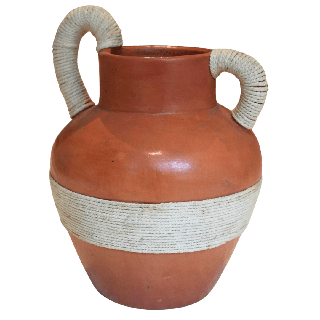 A robust, wide-shouldered terracotta vessel featuring a tapered base and a short, cylindrical neck flanked by two asymmetrical looped handles. The piece is distinguished by the application of thick, stark white natural fiber cord, which is meticulously hand-wrapped around both handles and encased in a broad horizontal band around the center of the bulbous body. This tactile element, inspired by traditional Balinese Tali (binding) techniques used in ceremonial craft, provides a clean, textile-like contrast against the smooth, sun-baked clay. Finished in a uniform burnt sienna wash, the vessel balances its primitive, functional silhouette with a modern, high-contrast decorative treatment that emphasizes the harmony between elemental fired earth and raw, unrefined fibers.