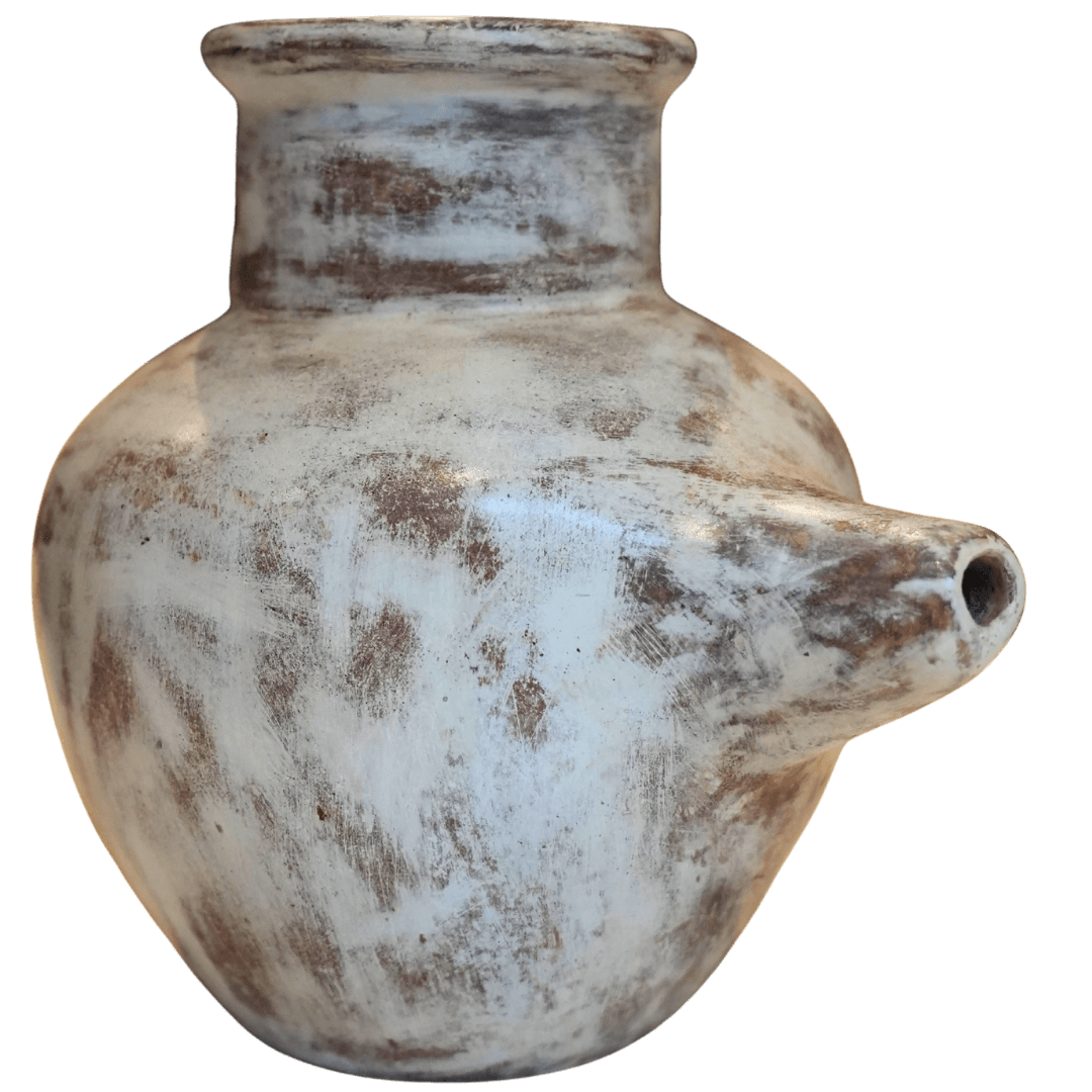 This hand-shaped terracotta vessel features a robust, bulbous body that tapers into a wide cylindrical neck with a reinforced, flared rim. A singular, conical spout extends sharply from the shoulder, meticulously integrated through traditional coiling techniques. The exterior is defined by a heavy, weathered surface treatment, where a chalky white slip has been applied with broad, expressive brushstrokes over a deep burnt umber base to create a rustic, calcified appearance. This distressed finish highlights the organic irregularities of the clay and the hand-worked nature of the form, evoking the timeless aesthetic of historical Balinese village utility-ware while serving as a sophisticated sculptural object that emphasizes raw, elemental textures and a sun-bleached, antiqued patina.