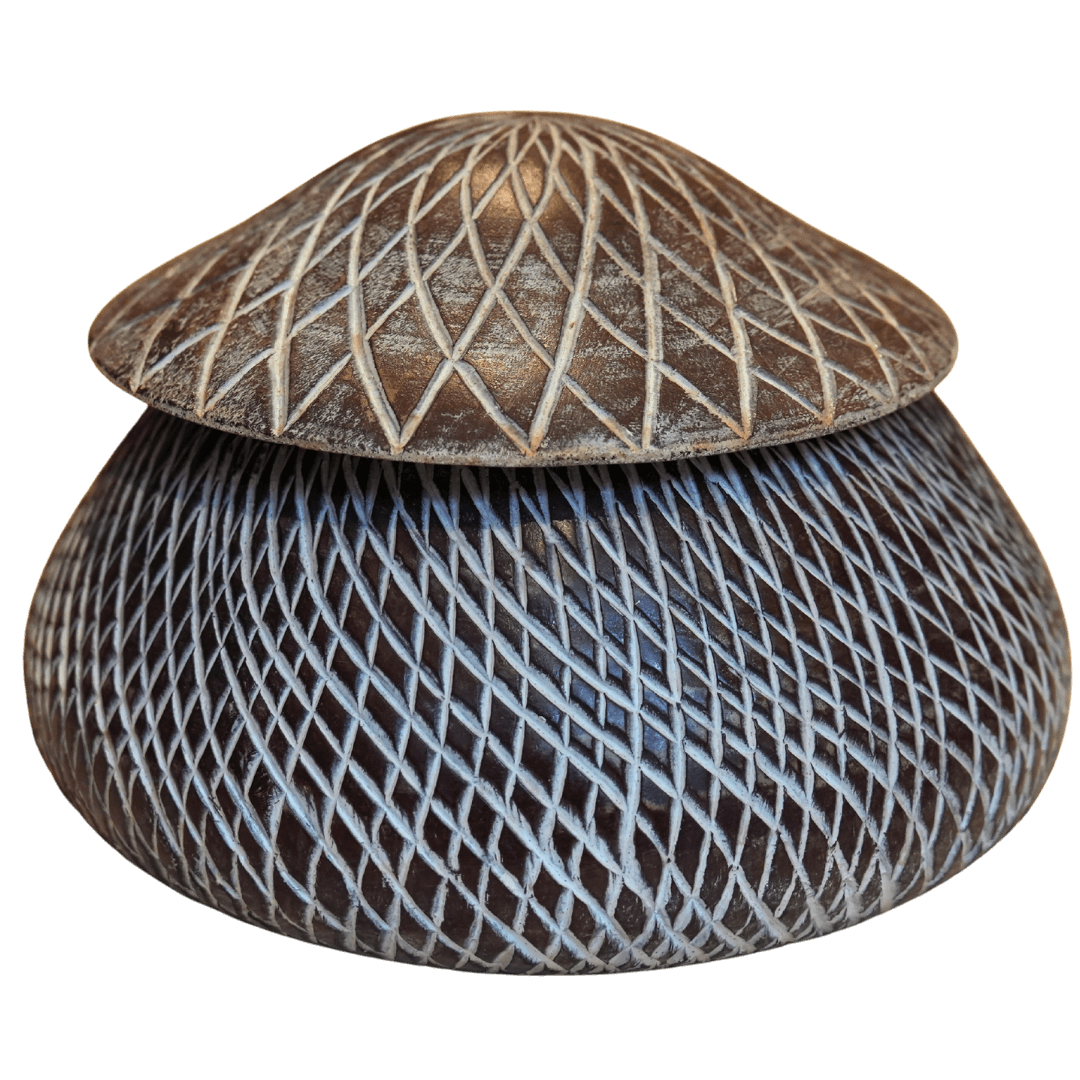 This hand-shaped terracotta vessel features a wide, bulbous body and a low-profile, conical lid that sits flush against the rim, meticulously formed using the traditional Pilin coiling method. The entire exterior surface is characterized by a dense, rhythmic Ukir carving of interlocking diamond shapes, creating a high-relief lattice pattern that wraps seamlessly around the circumference and the lid. A heavy, weathered white wash is applied over the deep burnt umber clay, settling into the geometric recesses to emphasize the precision of the tool work and the tactile, stone-like topography. The composition reflects a sophisticated Balinese artisanal style, where primitive storage forms are elevated through repetitive, architectural motifs and a sun-bleached patina inspired by traditional village pottery.