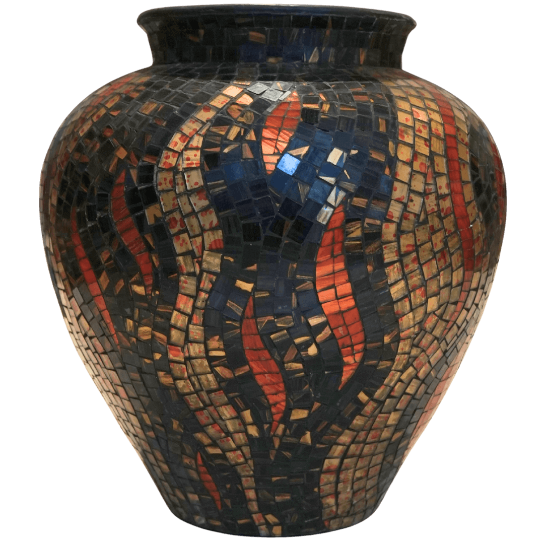 This hand-shaped terracotta vessel features a classic, high-shouldered amphora silhouette with a short, flared rim, entirely encased in an intricate Mozaik surface of hand-cut glass tiles. The decorative program consists of rhythmic, vertical “flame” motifs that undulate around the body, utilizing a fiery gradient of ember orange, crimson, and burnished gold glass shards against a dense obsidian black background. Each tile is meticulously set into a matte charcoal grout, creating a textured, light-reflective skin that emphasizes the vessel’s rounded topography while masking its earthy clay core. The composition reflects a bold, contemporary Balinese artisanal style, where traditional coiling methods are paired with vibrant geometric tiling to transform a functional form into a sophisticated, high-contrast sculptural object.