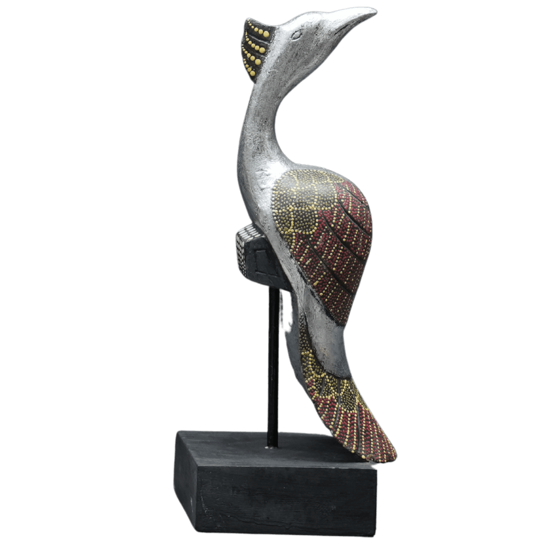 A slender, vertically oriented wood sculpture of a stylized avian figure, captured in a graceful upward-reaching pose and mounted on a minimalist black pedestal by a metal support rod. The form is shaped using the Ukir technique, featuring a sharp, tapered beak and a decorative, notched crest that lends a regal silhouette to the piece. The surface is primarily finished in a shimmering silver-leaf wash, which serves as a luminous base for the dense, rhythmic dot-work—reminiscent of traditional Balinese Titik (dot) painting styles—adorning the wings and tail. These hand-applied patterns in crimson red and ochre yellow create a vibrant, textured contrast against the metallic body, transforming a simple forest-inspired subject into a sophisticated work of contemporary folk art.