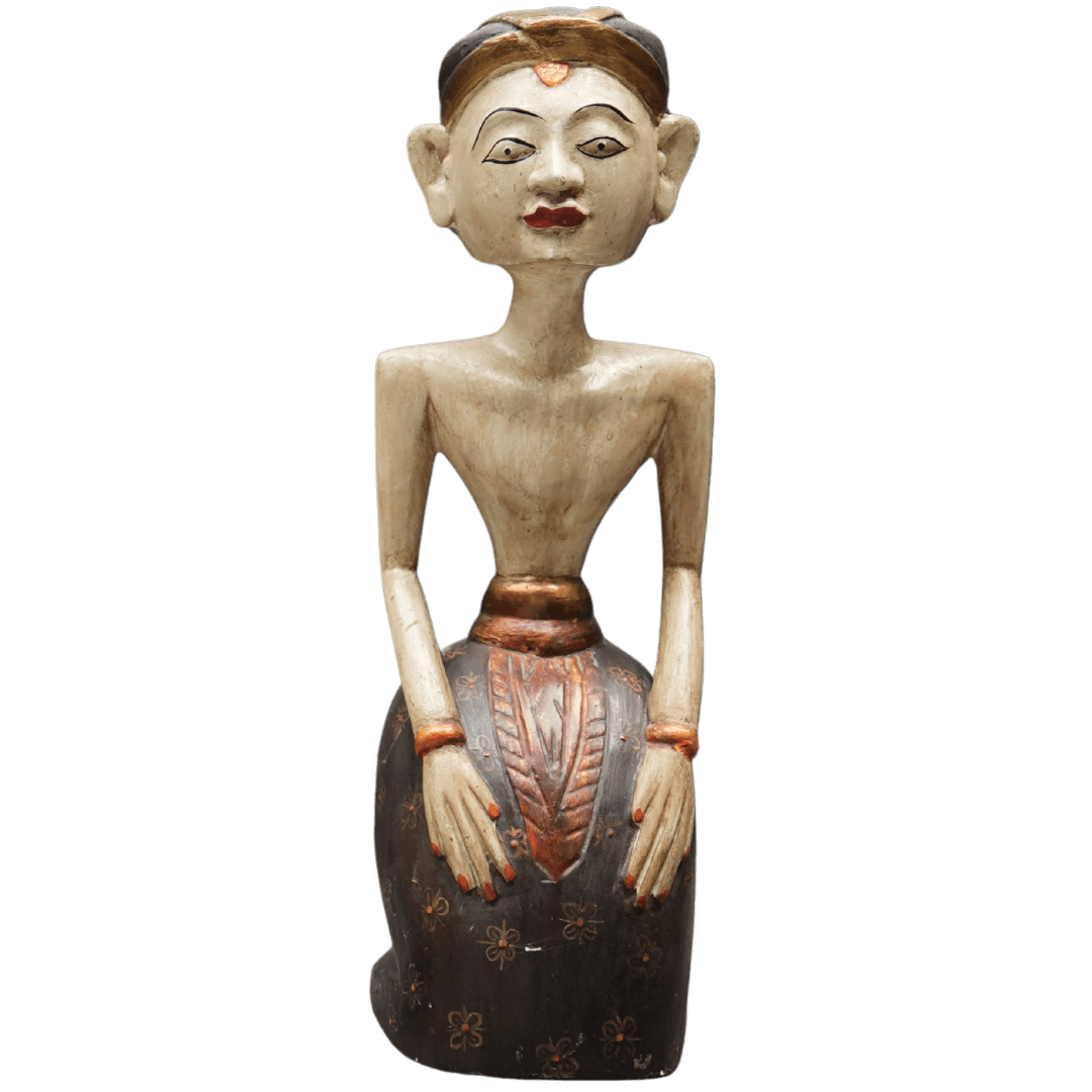 A slender, hand-carved wooden statue depicting a male bridegroom in traditional East Javanese attire, rendered with an elegant, elongated torso and a serene facial expression. The figure is meticulously shaped using the Ukir technique, featuring a charcoal-colored lower garment adorned with delicate, hand-painted floral motifs reminiscent of classic batik patterns. The sculpture’s surface is finished in a weathered ivory tone for the skin, contrasted by a traditional black headpiece and a mahogany-toned sash highlighted with subtle gold accents. This piece captures the dignified posture and refined cultural aesthetic of Javanese ceremonial customs, blending smooth anatomical carving with intricate, rhythmic surface ornamentation.
