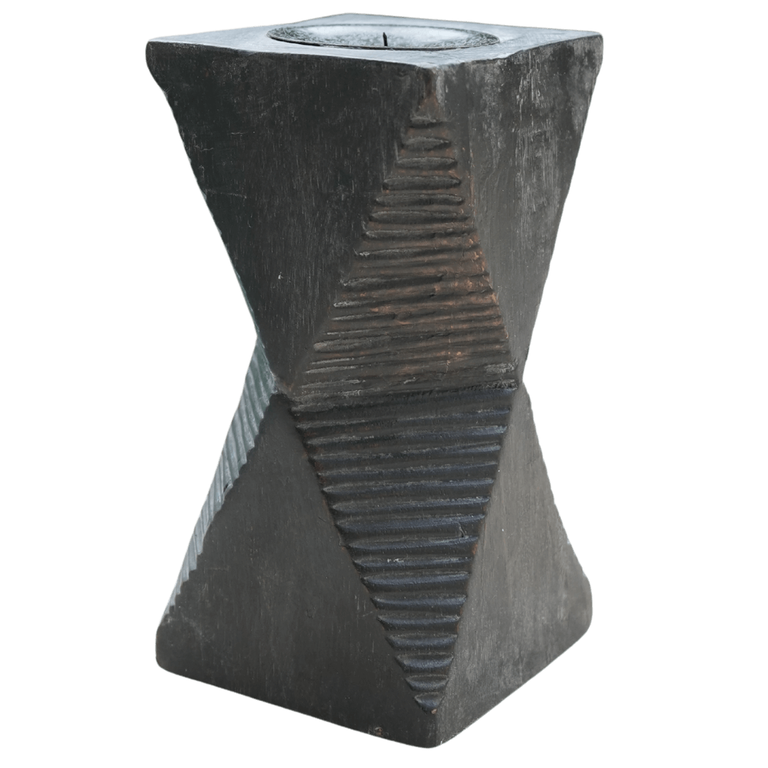 A contemporary sculptural piece defined by its striking hourglass silhouette and sharp, geometric facets that taper into a narrow central waist. The form is hand-carved from solid timber using precise chiseling techniques to create triangular planes, each adorned with a rhythmic series of horizontal grooves that provide a deep, tactile relief. Finished in a dense charcoal black wash, the surface absorbs light to highlight the structural integrity of the wood while a recessed circular basin at the flat summit provides a secure setting for a single candle. This piece seamlessly merges modern minimalist geometry with the traditional Balinese heritage of Ukir craftsmanship, resulting in a bold, architectural accent that celebrates high-contrast texture and form.