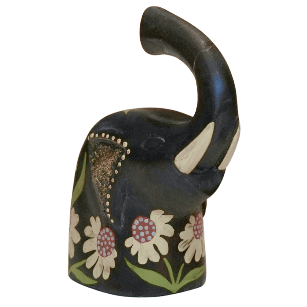A hand-carved wooden bust of an elephant, meticulously shaped using the Ukir technique, featuring an upright, curved trunk and prominent white tusks. The figure is finished in a dense obsidian black tone, which serves as a stark canvas for a vibrant garden of hand-painted daisies encircling the base in creamy white and terracotta red. The ears are distinguished by a traditional Titik (dotted) texture, outlined with a delicate row of white beads that adds a rhythmic, tactile relief to the profile. This piece reflects a classic Balinese export aesthetic from the late 20th century, blending smooth anatomical carving with cheerful folk-art motifs and a playful use of high-contrast botanical patterns.