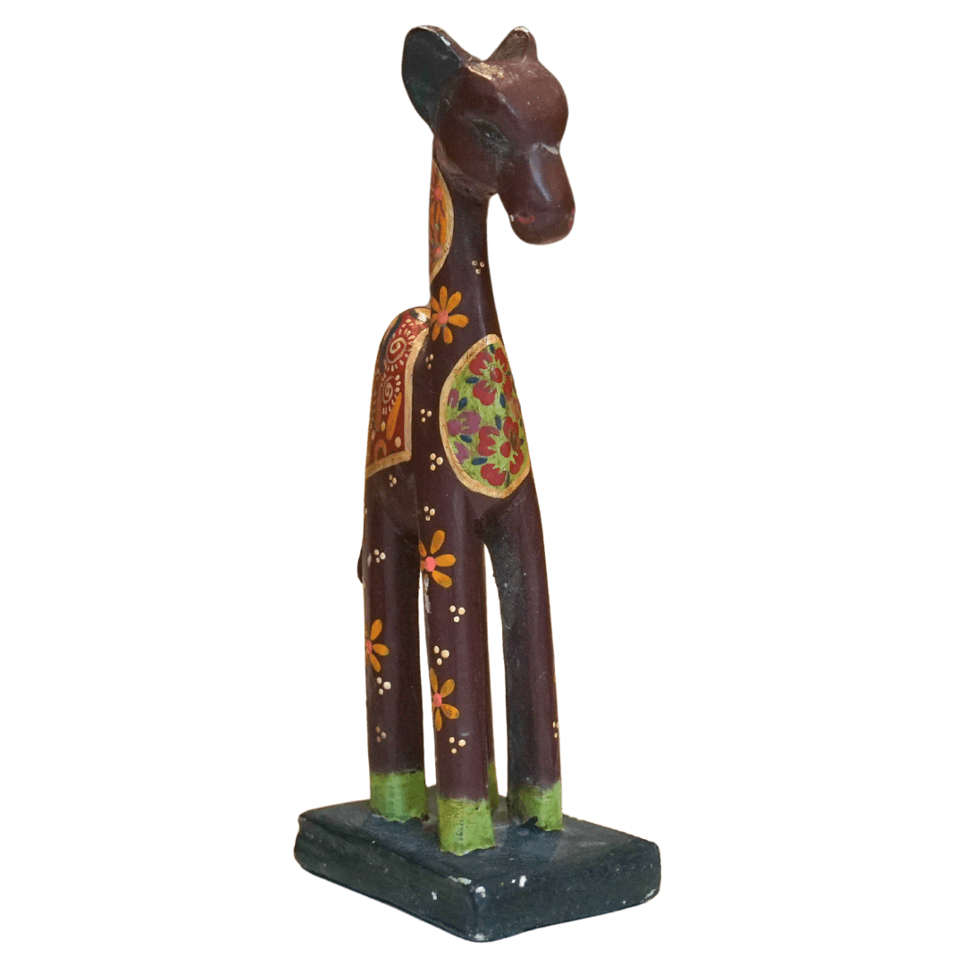 This hand-carved wooden figure depicts a stylized giraffe in a seated, upright position, mounted on a solid obsidian-colored rectangular base. Crafted using traditional Ukir techniques, the sculpture features a smooth, slender neck and rounded head, finished in a deep espresso brown wash. The body is intricately decorated with hand-painted floral medallions and delicate orange blossoms, highlighted by rhythmic white Titik (dotted) accents that emphasize its anatomical curves. A vibrant terracotta saddle motif with scrolling patterns is rendered across its back, while the lower limbs are finished in a contrasting lime green gradient, blending a playful folk-art aesthetic with the meticulous detail characteristic of late 20th-century Balinese woodcraft.