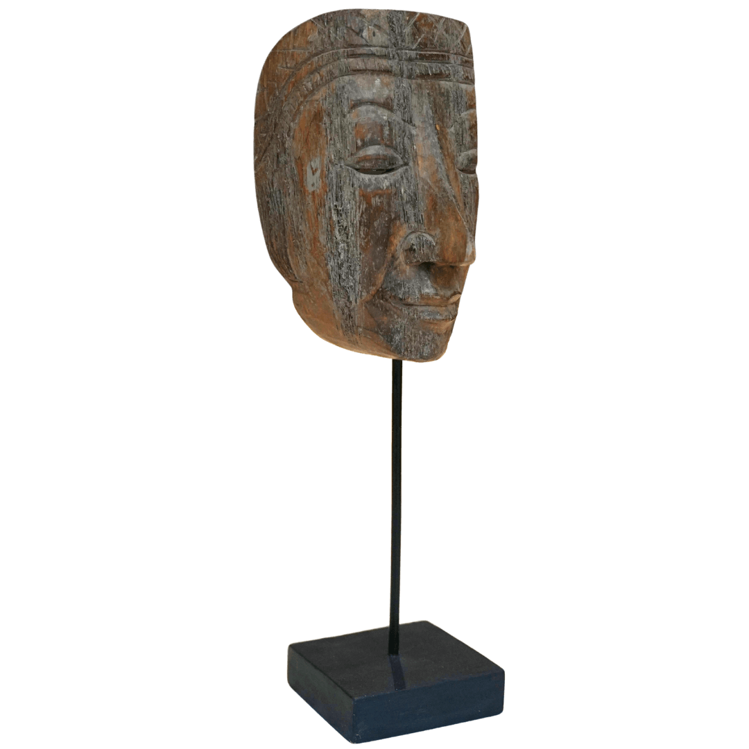 A hand-carved wooden sculpture featuring a stylized human face with serene, closed eyes and a prominent, elongated nose, meticulously shaped using the traditional Ukir technique. The piece is characterized by its heavily distressed surface, where the natural grain of the wood is accentuated by a weathered driftwood grey patina and deep umber undertones, suggesting an ancient, excavated relic. Across the forehead, a series of rhythmic, etched cross-hatch patterns provide a crown-like ornamental detail that adds textural depth to the smooth, contemplative expression of the mask. Mounted on a slender metal rod atop a solid, obsidian-black rectangular pedestal, the composition balances the raw, organic soul of the timber with a clean, modern display format, celebrating the timeless stone-carving aesthetics of Balinese architectural masks through a rustic wooden medium.