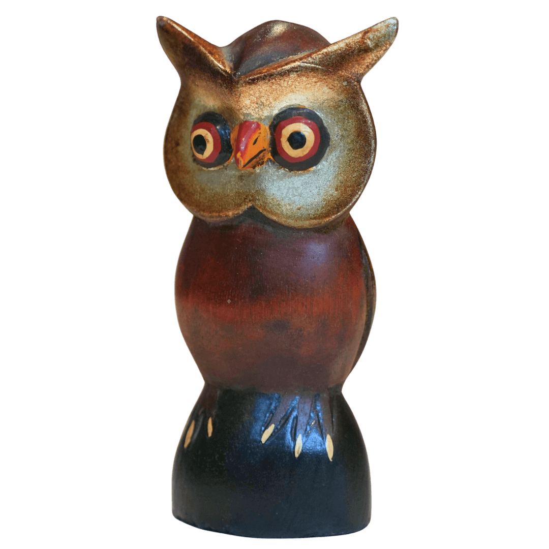 A hand-carved wooden figurine of an owl, meticulously shaped using the Ukir technique into a solid, upright ovoid form that rests on a rounded, obsidian-black base. The piece features a rich mahogany brown body that transitions into a wide, heart-shaped facial plane finished in a weathered sage green and ochre wash. The large, expressive eyes are rendered with concentric rings of crimson and black, creating a bold, watchful gaze that is complemented by a small, pointed orange beak. Detailed brushwork is visible on the base, where pale yellow Titik (dotted) accents represent the bird’s talons, resulting in a rustic yet spirited artisanal object that blends traditional Balinese carving with expressive, nature-inspired folk art.