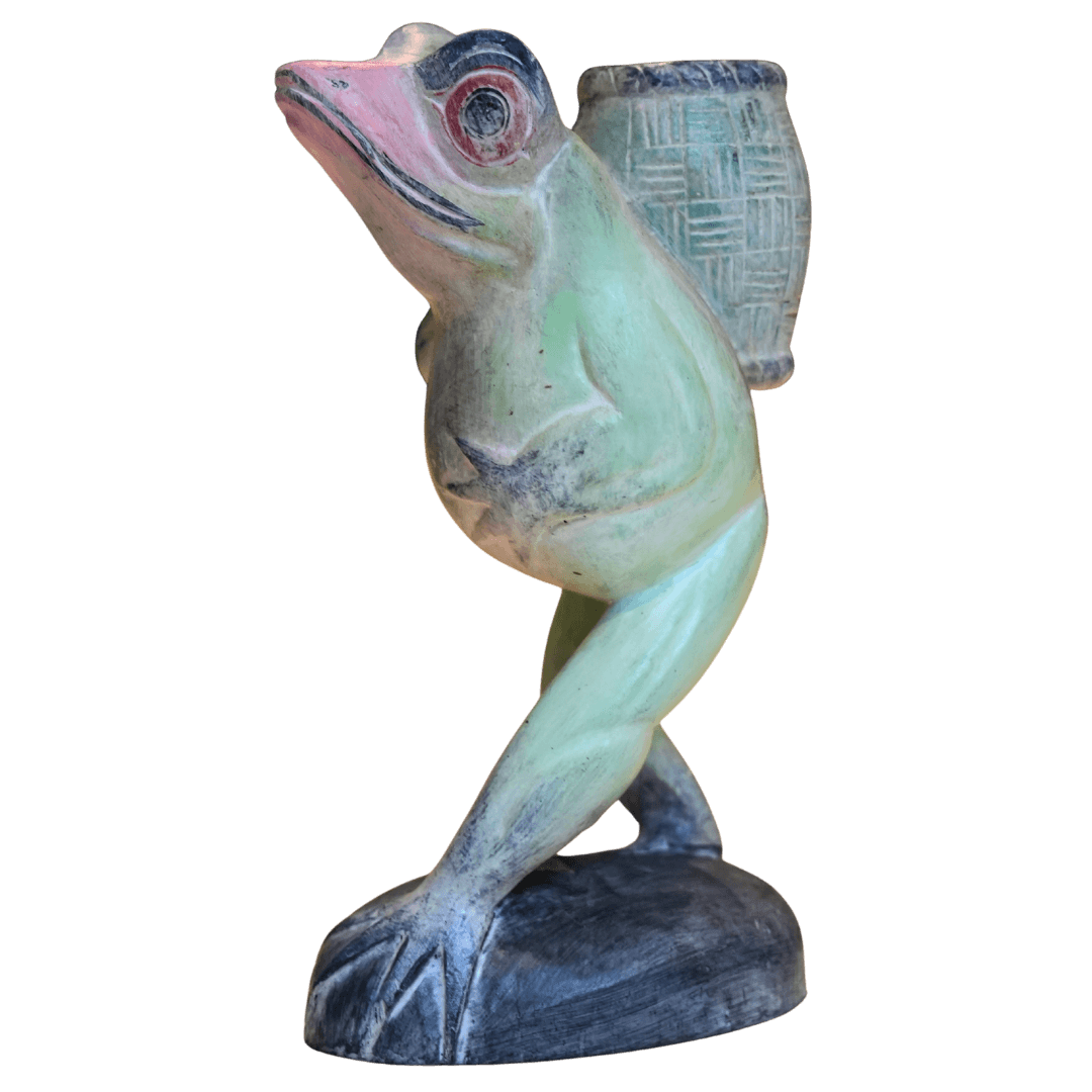 A hand-carved wooden figure depicting an anthropomorphic frog in a dynamic, upright walking posture, meticulously shaped using the traditional Ukir technique. The figure carries a small, cylindrical woven-style basket on its back, reminiscent of a traditional Berkat or village carrying pack, which is rendered with a fine cross-hatched texture in a weathered sage green. The body is finished in a soft mint green gradient that transitions to a pale rose wash at the snout and throat, while the large, expressive eyes are detailed with concentric crimson and obsidian rings. Mounted on a rounded, slate-grey base that suggests a river stone, the piece exemplifies a classic late-20th-century Balinese export style, blending whimsical anatomical proportions with a gentle, hand-painted pastel palette and a focus on spirited, character-driven movement.