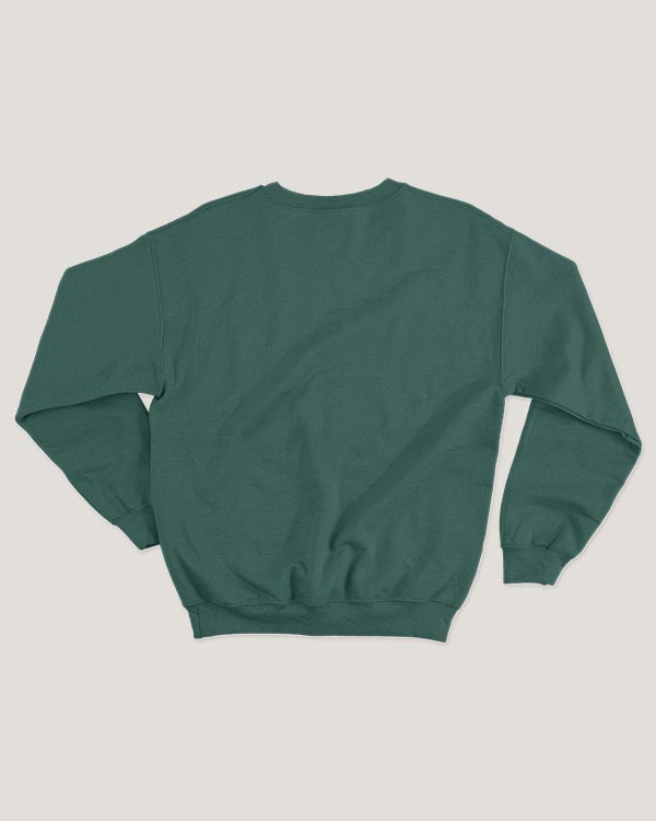 A forest-green boxy sweater made from premium fleece, featuring bold screen-printed typography.